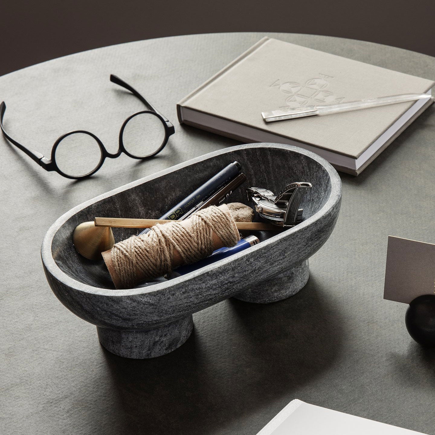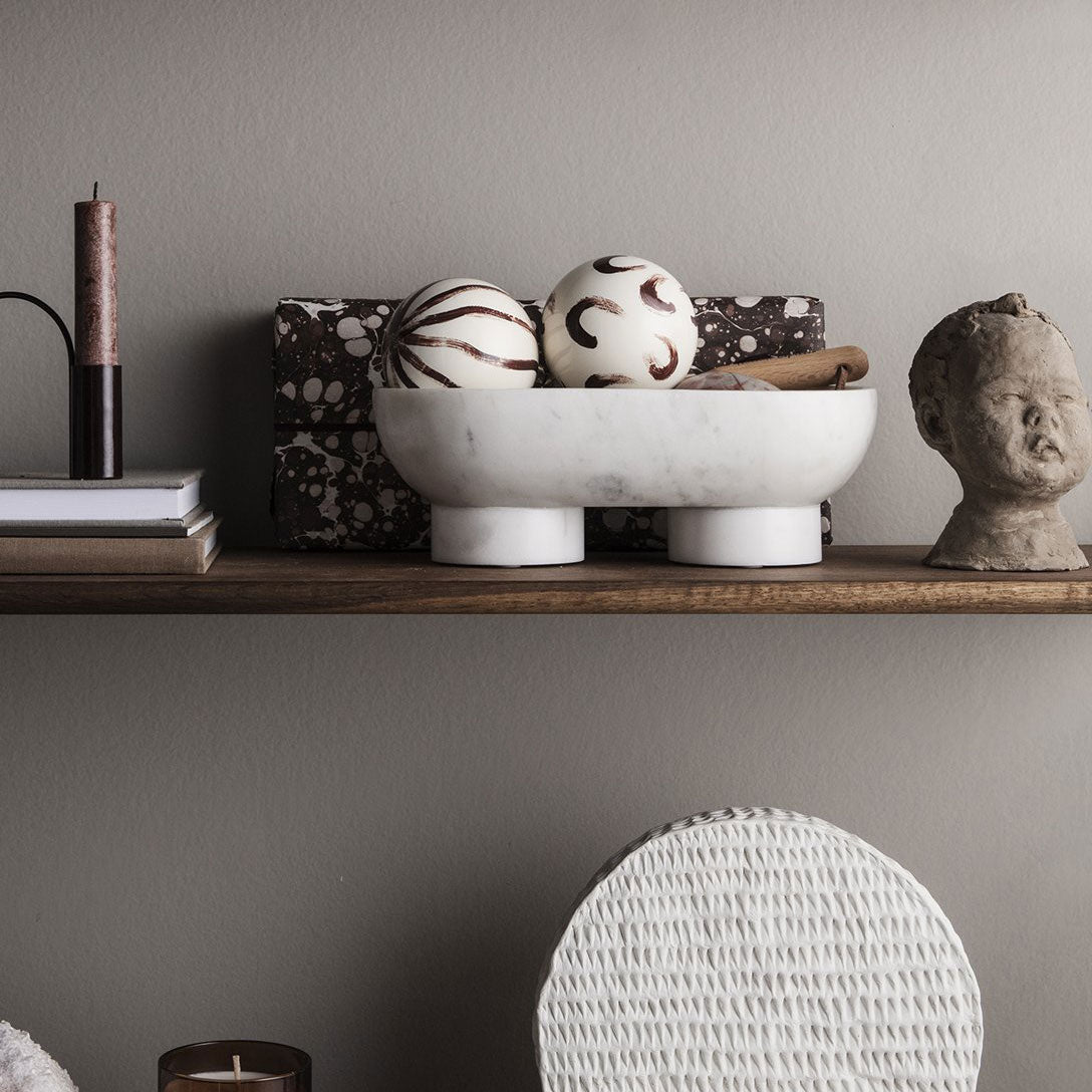 Challenging the expression of a classic bowl, the ALZA Bowl has an elevated design with its tray based on a sturdy plateau. Both light and grounded, this design unites contrasts and lets them come together in a beautiful black marble bowl. As marble is a natural material, slight variations from product to product may occur. May be used as a catch all in an entry way, for serving food, or simply as a decor piece.