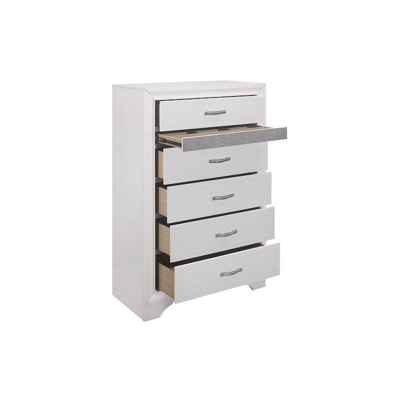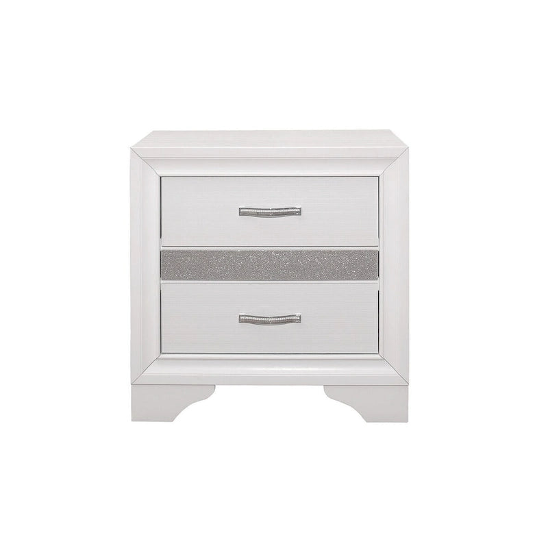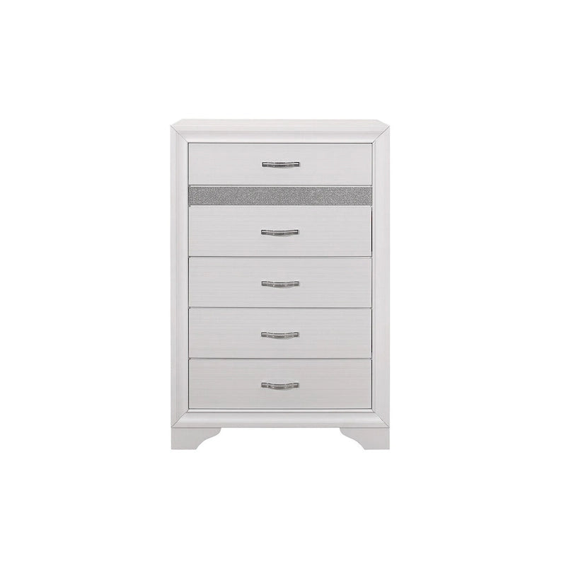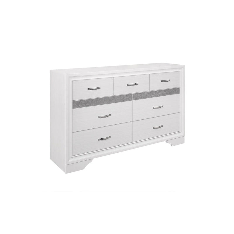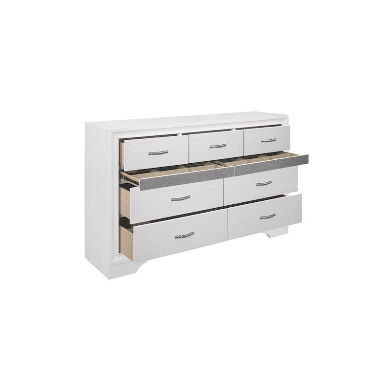 The unique styling of the Beatrice Collection presents a glamorous option for your bedroom. Embossed faux-wood veneer features a white finish that allows for the acrylic silver glitter fronts of the hidden jewelry drawers to shine. The jewelry drawers feature felt lining to protect your hidden items from wear and tear. The panel headboard features acrylic silver glitter accent banding as well as a silver faux leather channel-padded insert. Polished chrome bar drawer pulls front the drawers providing complementing contrast to the collection's finish.