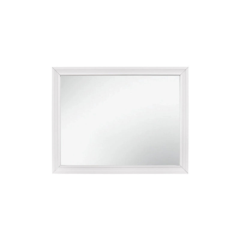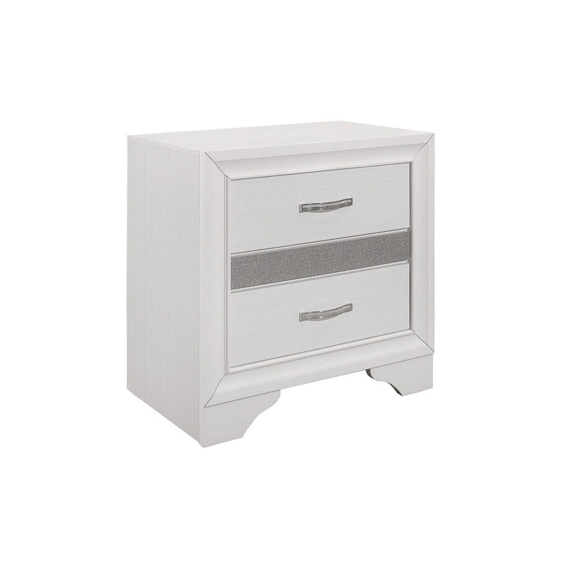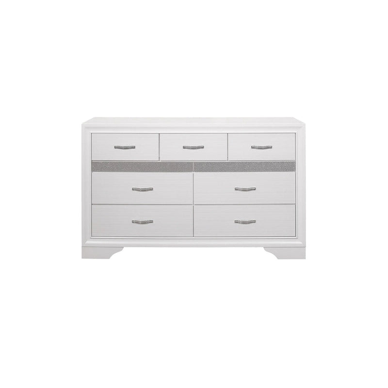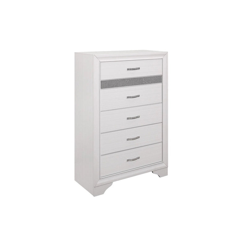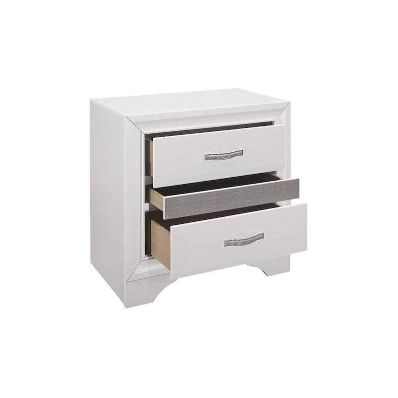 The unique styling of the Beatrice Collection presents a glamorous option for your bedroom. Embossed faux-wood veneer features a white finish that allows for the acrylic silver glitter fronts of the hidden jewelry drawers to shine. The jewelry drawers feature felt lining to protect your hidden items from wear and tear. The panel headboard features acrylic silver glitter accent banding as well as a silver faux leather channel-padded insert. Polished chrome bar drawer pulls front the drawers providing complementing contrast to the collection's finish.