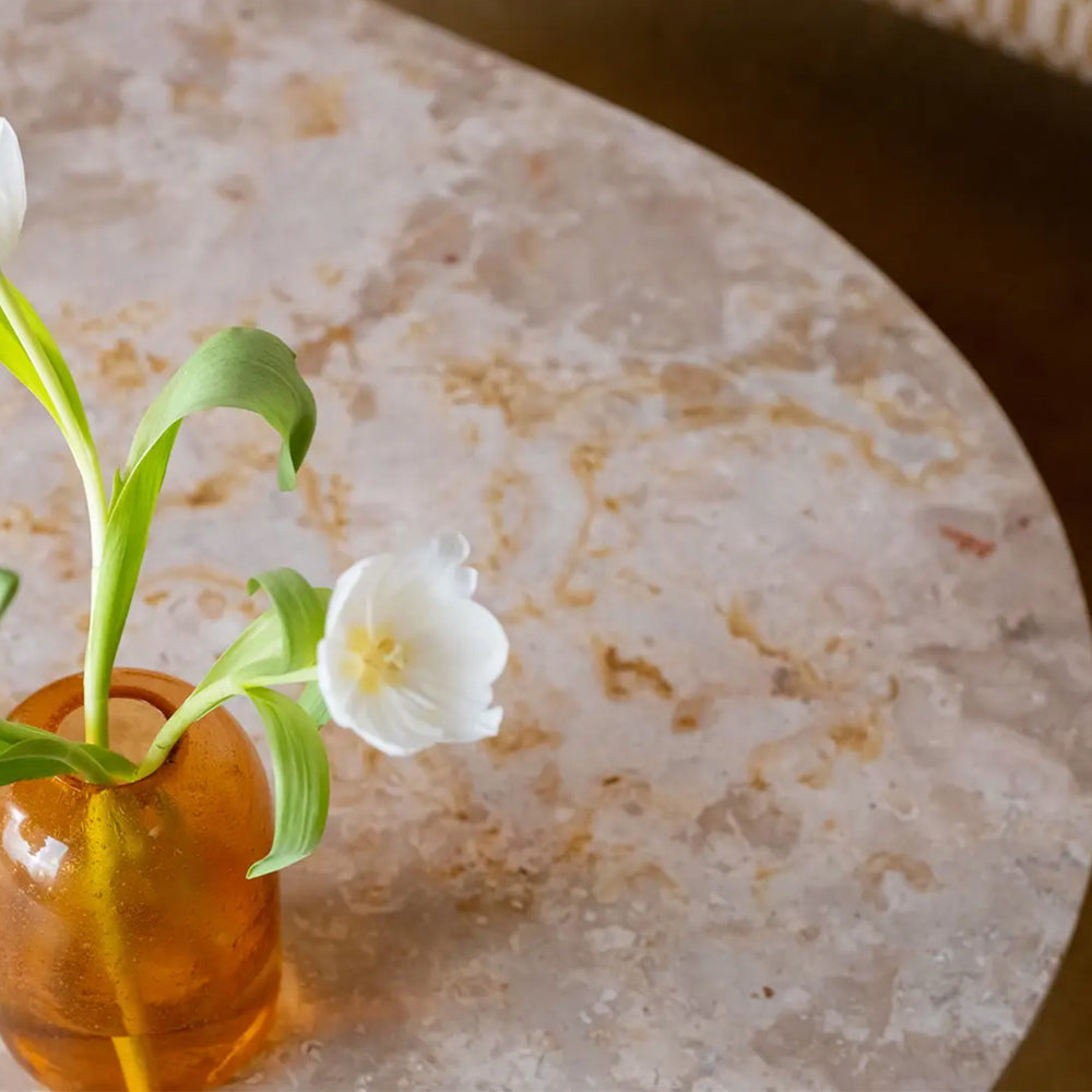 A cure for square spaces. Cameron is all about the soft landing. Its capsule-shaped marble top rests on a slightly flared oak pedestal, picking up on the base’s rounded form. The warm wood draws out the marble’s natural veining, giving the whole piece a quiet sense of cohesion. Designed to round out sharper spaces, it brings sculptural balance where form meets feeling.