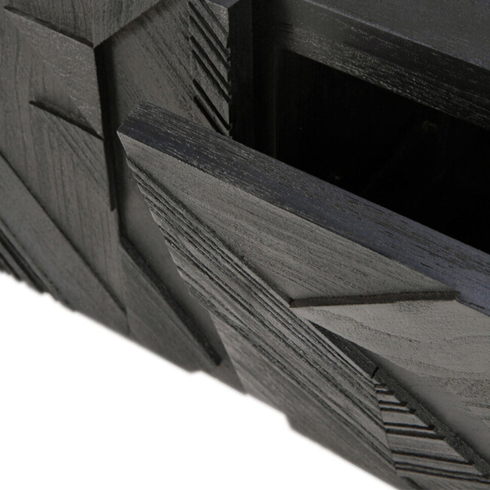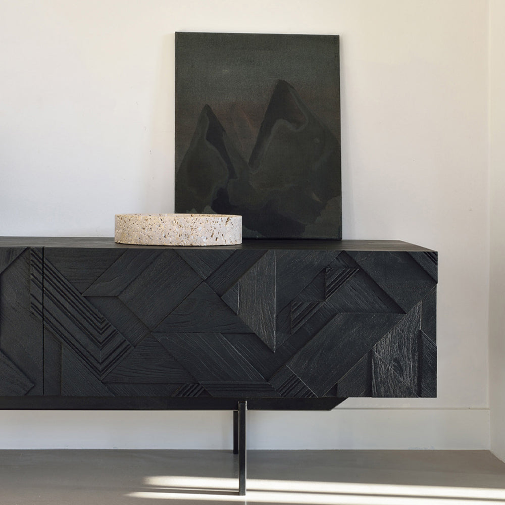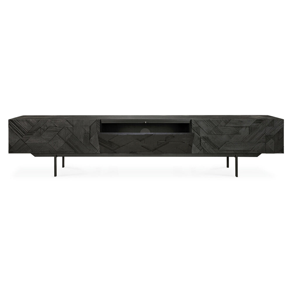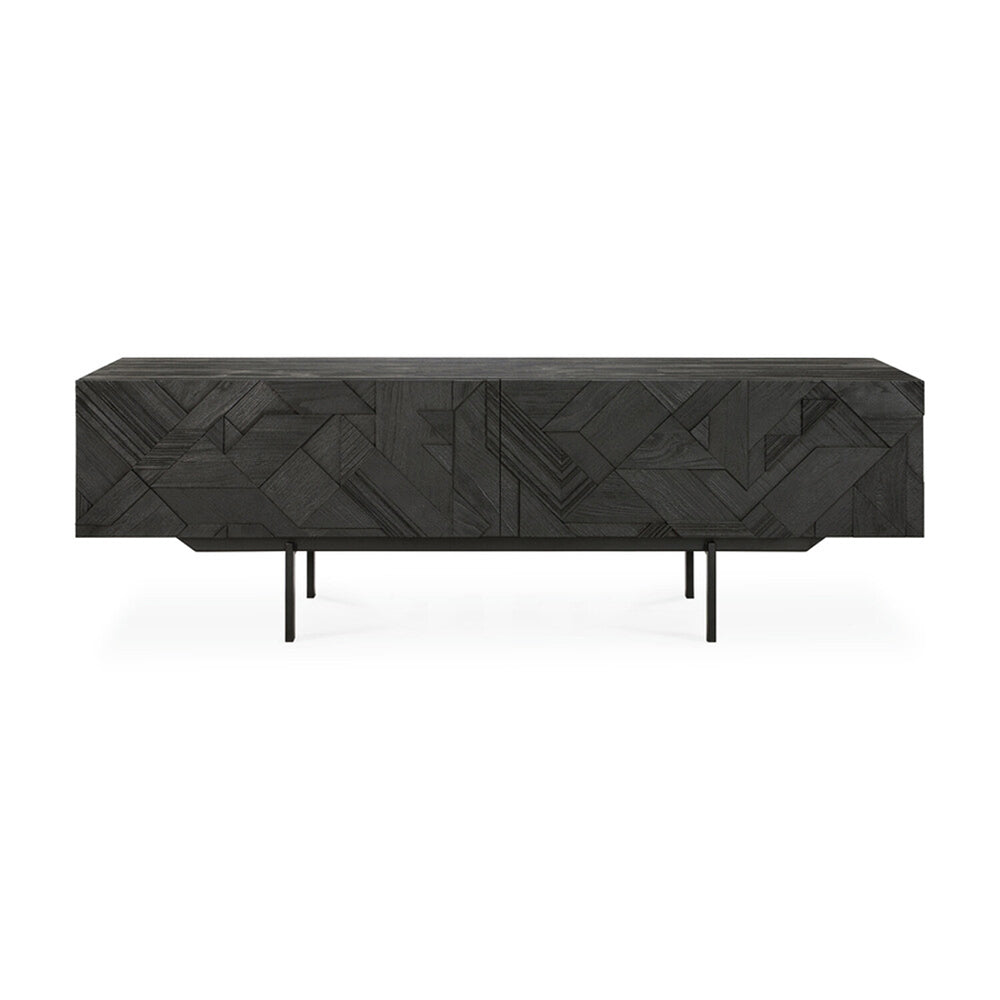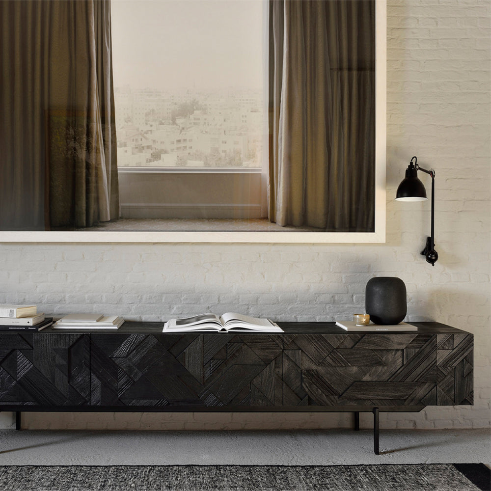 In his quest to add movement to the surface, our designer Alain van Havre started layering and combining triangular shapes. Before he knew it, he had created an interesting composition out of teak. We ended up brushing the surface to highlight the grain and further emphasize the feeling of motion. Originally used for our popular Teak Graphic sideboard, the pattern now translates perfectly to a new TV cupboard.