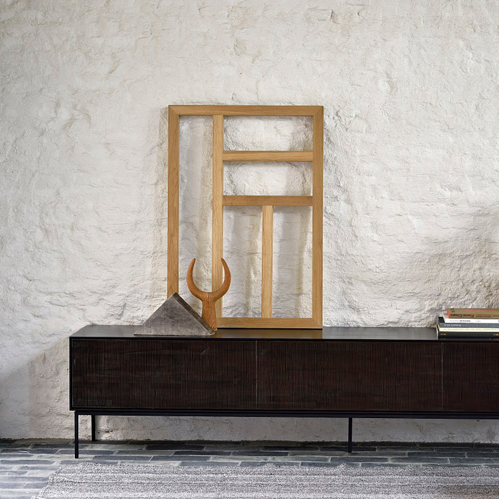 The Grooves TV cupboard is soulful to say the least. Every single line you see is hand carved, making each piece truly unique. Small imperfections are part of the story, even more so: they enhance Grooves' character. The result is a slightly different surface every time, each with its own rhythm and dynamics. The beautiful dark tinted teak continues on the inside, where shelves and drawers will hold your most cherished objects.