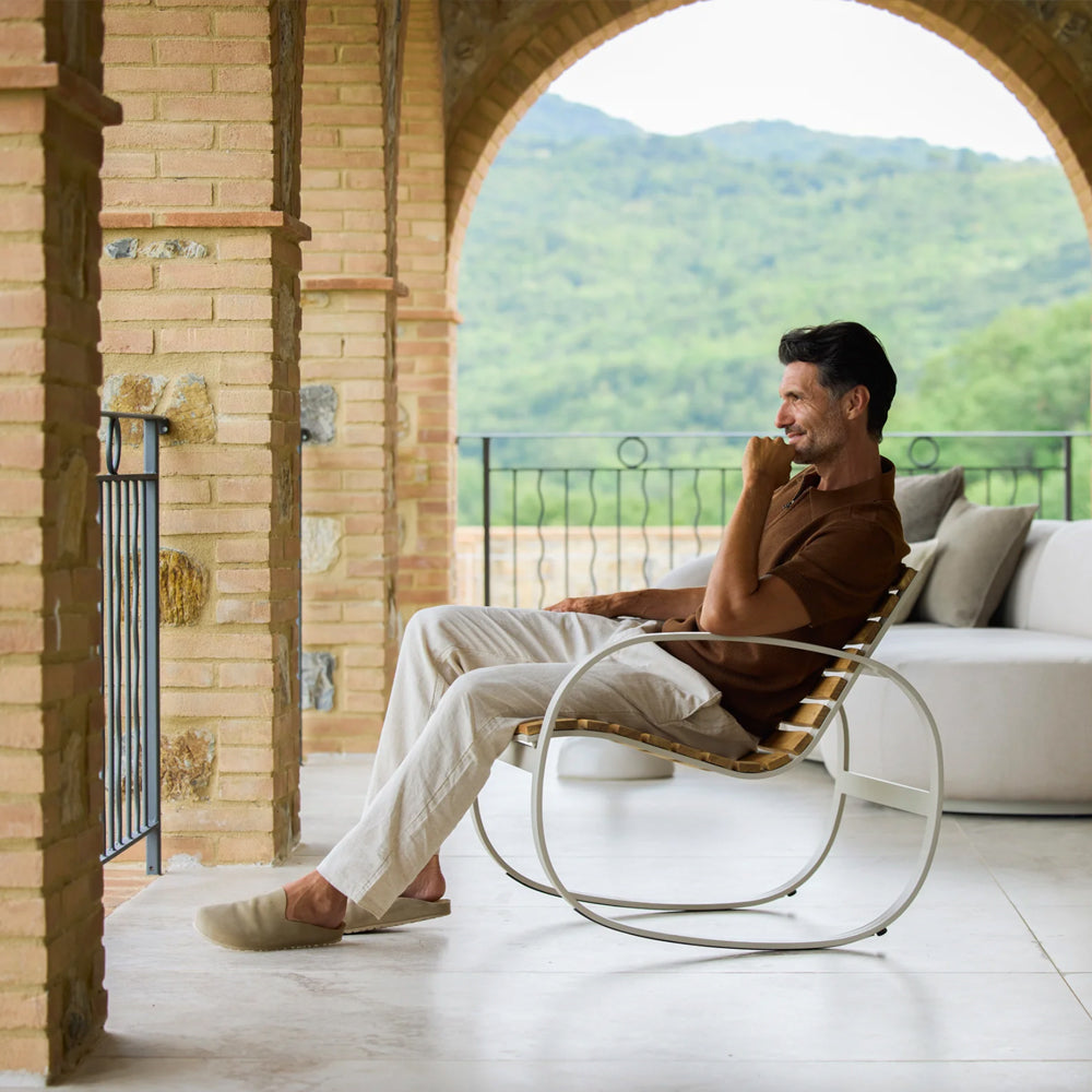 The Parc rocking chair is a refined and exclusive rocking chair designed by the Danish duo Foersom & Hiort-Lorenzen MDD. The rocking chair has an eye-catching design with its sculptural shape in premium teak and sleek aluminium – a beautiful combination of natural and minimalist design. The Parc rocking chair is designed with comfort in mind, with a seat and backrest that are shaped to follow the body's natural shape, providing a high level of comfort for relaxation. The rocking chair has two blocks on the legs, so you don't have to worry about tipping over when you lean back.